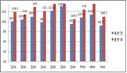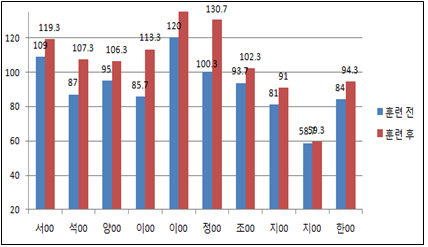 그 결과 훈련 전 검사에서 훈련참가학생 평균 K-WCPM이 약 99.3어절이었는데 비하여 훈련 후 검사에서는 평균 K-WCPM이